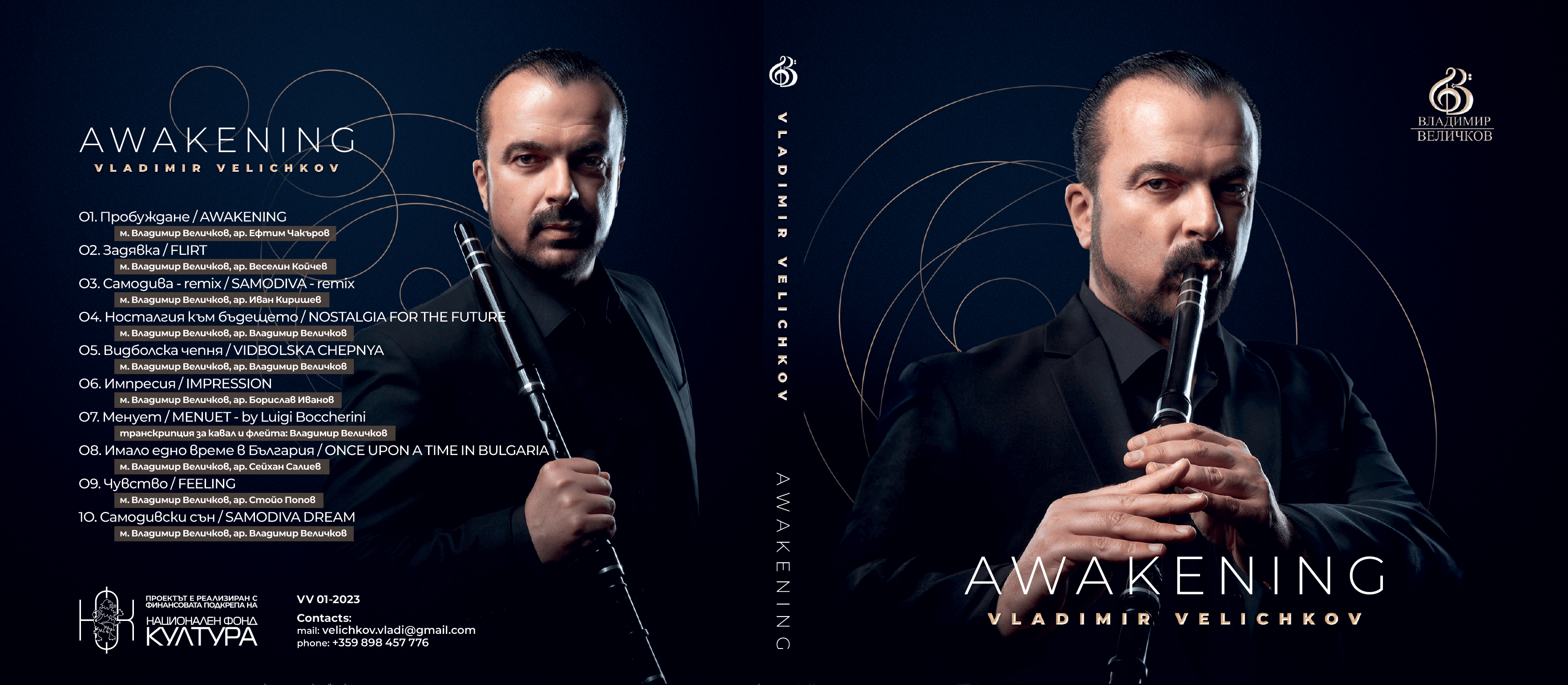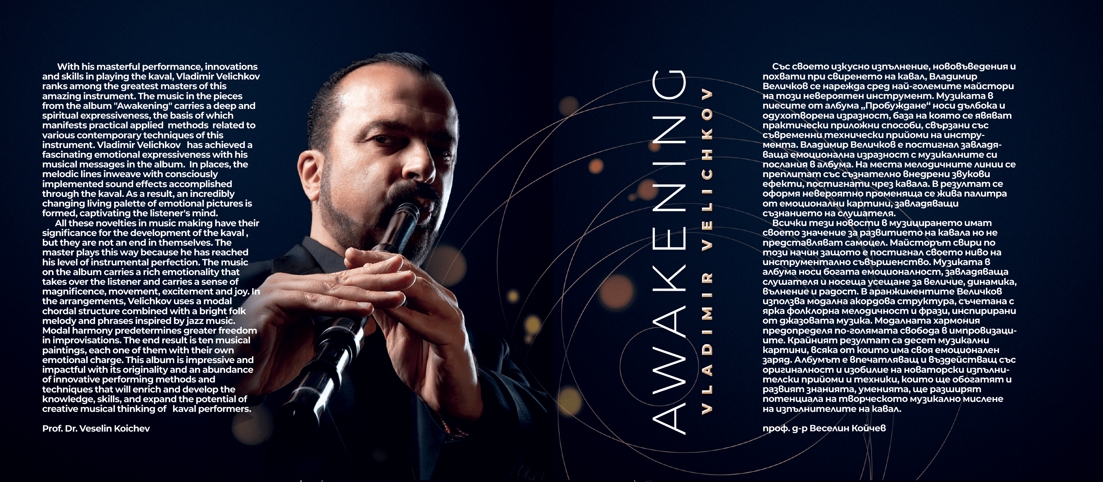 With his masterful performance, innovations and skills in playing the kaval, Vladimir Velichkov ranks among the greatest masters of this amazing instrument. The music in the pieces from the album “Awakening” carries a deep and spiritual expressiveness, the basis of which manifests practical applied methods related to various contemporary techniques of this instrument. Vladimir Velichkov has achieved a fascinating emotional expressiveness with his musical messages in the album. In places, the melodic lines inweave with consciously implemented sound effects accomplished through the kaval. As a result, an incredibly changing living palette of emotional pictures is formed, captivating the listener’s mind.